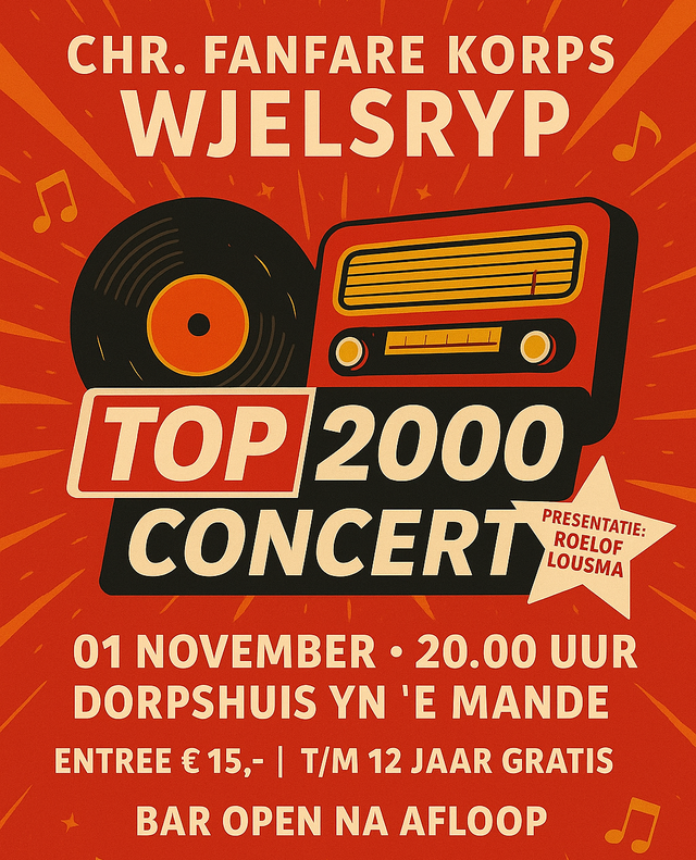 Van Abba tot Queen, van Adele tot Coldplay en van Claudia de Breij tot Henk Poort! Twee zangers uit eigen dorp zingen hun favoriete Top2000 nummer samen met Concordia. De presentatie is in handen van Roelof Lousma, radiopresentator bij Omrop Fryslân. De bar is de gehele avond geopend. Een compleet avondje uit dus. Dit wilt u niet missen!