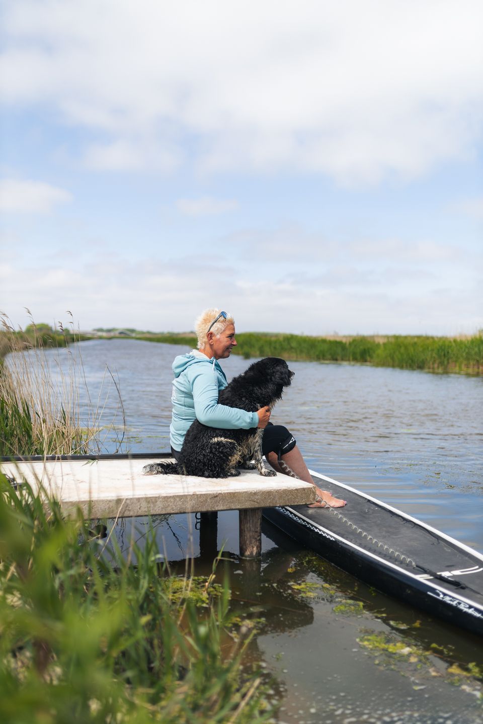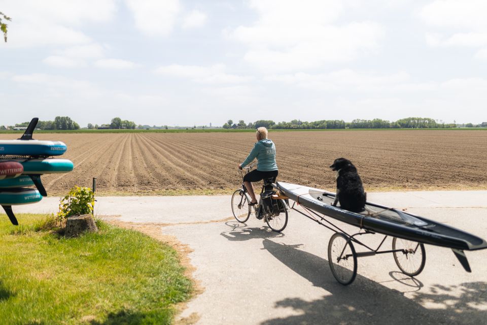 Om bij het water te komen, heeft Loesanne vervoer; twee volledig opgeladen elektrische fietsen staan klaar voor ons om de route naar het water af te leggen. Haar eigen fiets heeft een trekhaak om de kar met sup achter te hangen. Voordat we gaan, worden we indringend aangekeken door Tiesker de Friese Stabij. “Tiesker weet dat als de fiets met aanhanger klaarstaat, dat hij mee mag. Ik heb ook nog een trekker waar sups achterop kunnen voor als ik een grote groep heb, maar met kleine groepjes, pakken we allemaal de fiets”, legt Loesanne uit. Tiesker rijdt het eerste stuk mee op de van carbon gemaakte sup en over het hobbelig gedeelte van het parcours, rent hij voor ons uit op weg naar de steiger.