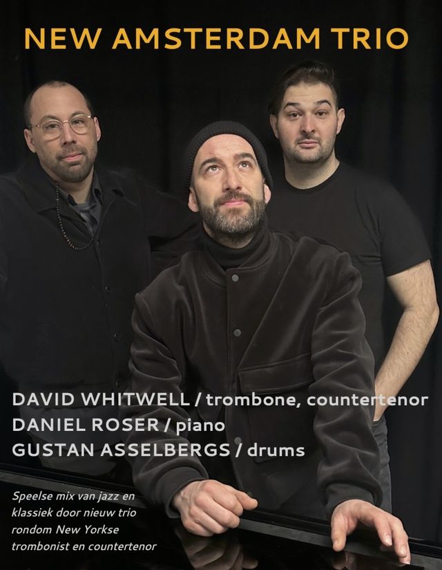 Het New Amsterdam Trio is een internationale samenwerking tussen de New Yorkse trombonist en countertenor David Whitwell, de Zwitserse pianist Daniel Roser en de Nederlandse drummer Gustan Asselbergs. Samen banen zij een nieuw pad in de geïmproviseerde muziek. Zij verweven aria’s van Bach en liederen van Schubert en Purcell – evenals Amerikaanse folksongs – naadloos met hun eigen, toegankelijke en tonaal georiënteerde improvisaties.