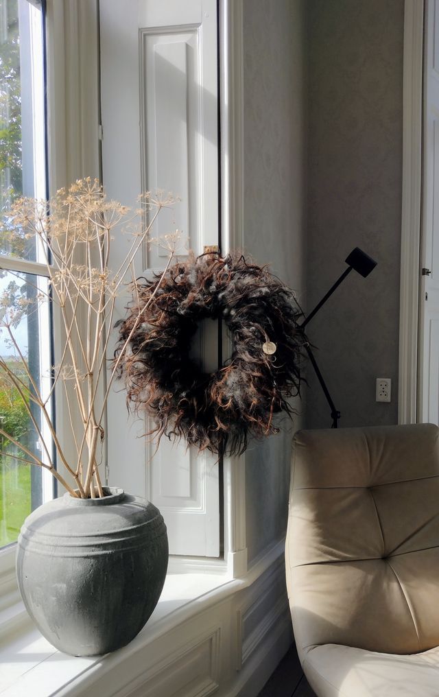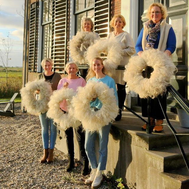 Voor de krans gebruiken we, voor het mooiste resultaat, zachte handgewassen langharige wol met krullen (kleur naar keuze).ย