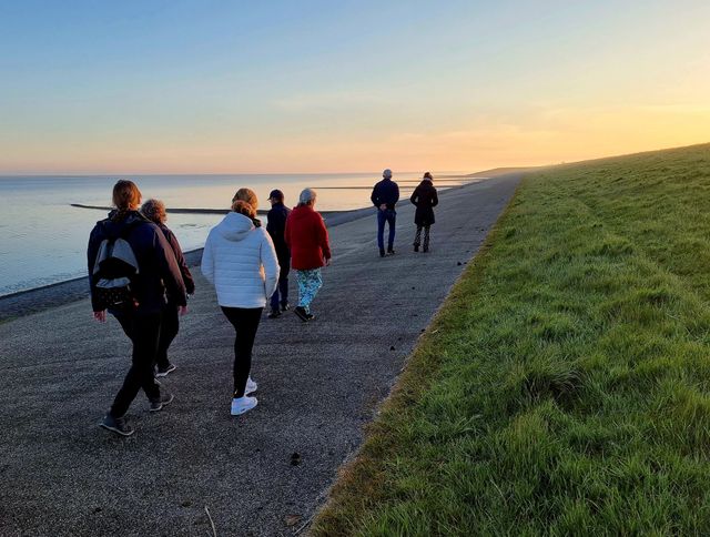 Ontvangst om 05:00 uur met koffie/thee. Vanuit het centrum van Sexbierum wandelen we vervolgens in een rustig tempo via het 'Sexbierumerbos' (Liauckama State) naar de Waddenzeedijk. We lopen langs historische boerderijen (staten) en tussen de vruchtbare akkerlanden door waar trotse Friese boeren hun gewassen als aardappelen, graan, kool, bieten, maïs en zelfs tulpen telen. Geniet van de weidse uitzichten en schitterende wolkenluchten. Aan de Waddenzee kunnen we bij helder weer zelfs de Waddeneilanden Vlieland en Terschelling zien.