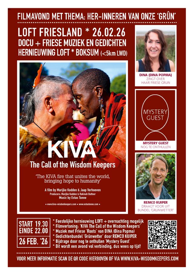 We nodigen je daarom van harte uit voor een hartverwarmende KIVA film- en sprekersavond, ter gelegenheid van de hernieuwing van LOFT FRIESLAND! Een avond vol verbinding rond de documentaire KIVA – The Call of the Wisdom Keepers. Een hoopvolle boodschap van inheemse Wisdom Keepers wereldwijd hoe we ons opnieuw kunnen verbinding met onze 'grun', taal, cultuur, natuur en elkaar.