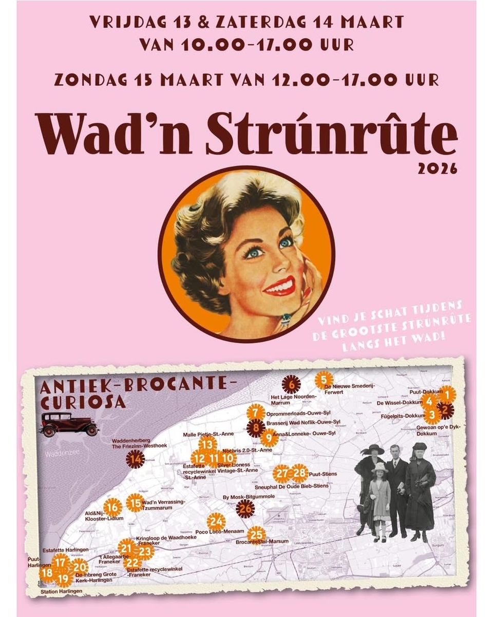 Met m kringloopwinkels, snuffelschuurtjes en sneuphokken tussen Harlingen en Dokkum is er volop te ontdekken. Bezoekers strúnen naar ABC – Antiek, Brocante en Curiosa – langs verrassende locaties vol tweedehands schatten en verborgen parels. De route is vrij te starten; op elke locatie liggen gratis routekaartjes klaar. Ook zijn er horecazaken aangesloten, waar bezoekers onderweg kunnen genieten van iets lekkers en een rustmoment.