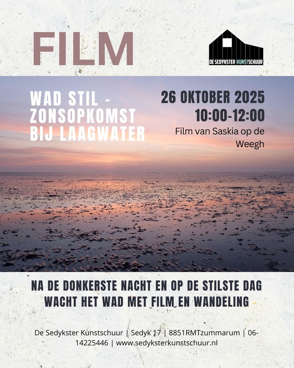 Op de Dag van de Stilte: wandeling langs de Waddenzee en de film Wad Stil – Zonsopkomst bij Laagwater in De Sedykster Kunstschuur in Tzummarum.