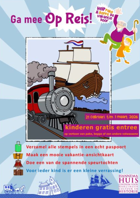 In de voorjaarsvakantie (21 februari t/m 1 maart) hebben alle kinderen gratis toegang tot museum het Hannemahuis, onder begeleiding van een volwassene. Dat mag een pake of beppe zijn, maar ook een moeder, vader, buurvrouw of grote broer. Let op: het museum is gesloten op maandag 23 februari.