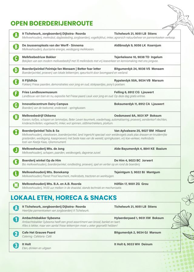 Elke boerderij biedt iets eigens: van Friese paarden in Marssum en een melk - demonstratie in een 34 stands draaistal in Grou (14:00 uur) tot de geschiedenis van de melkveehouderij in het Fries Landbouw Museum (gratis toegang).
