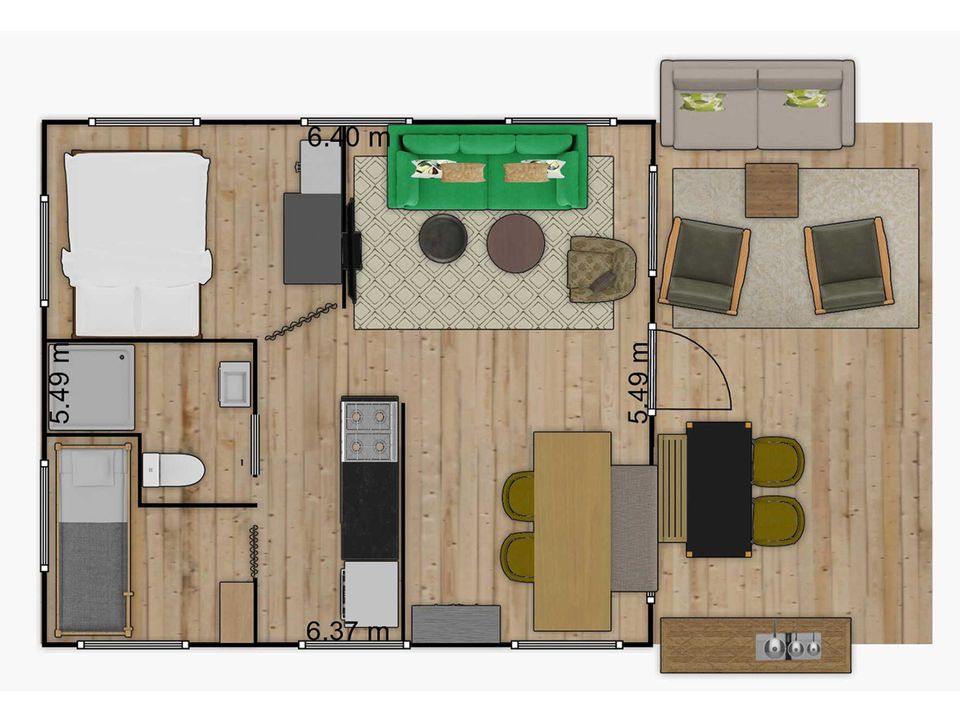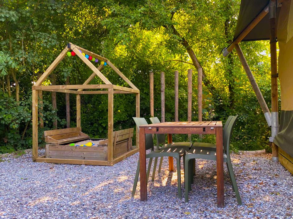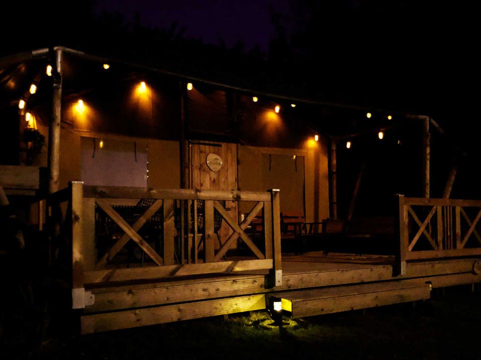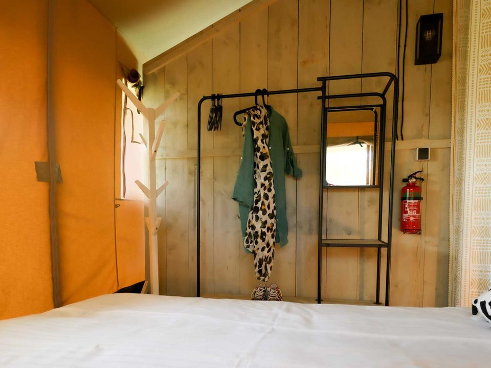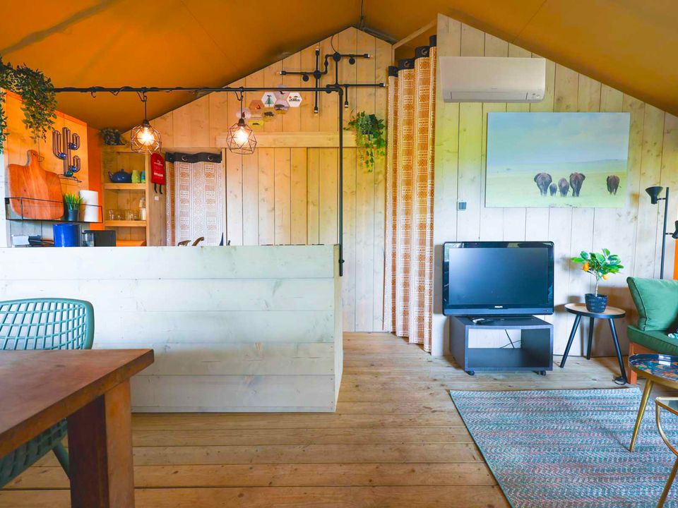 Op safari in Friesland? Het kan in deze stoere en sfeervolle safaritent in Grou. Mét airco om te koelen of verwarmen. De tent is geschikt voor vier personen en heeft twee slaapkamers. Eén van de kamers heeft een tweepersoonsbed en de andere kamer een stapelbed. Er is een knusse leefruimte met eet- en zithoek en een complete keuken. Deze keuken is van alle gemakken voorzien, zoals vaatwasser en Nespresso! Tevens heb je je eigen badkamer met douche, toilet en wastafel. Op de veranda is een extra buitenkeuken en er staat comfortabel buitenmeubilair. In de privé achtertuin is ook een zitje, eetset, barbecue én er is een zandbak voor de kids.