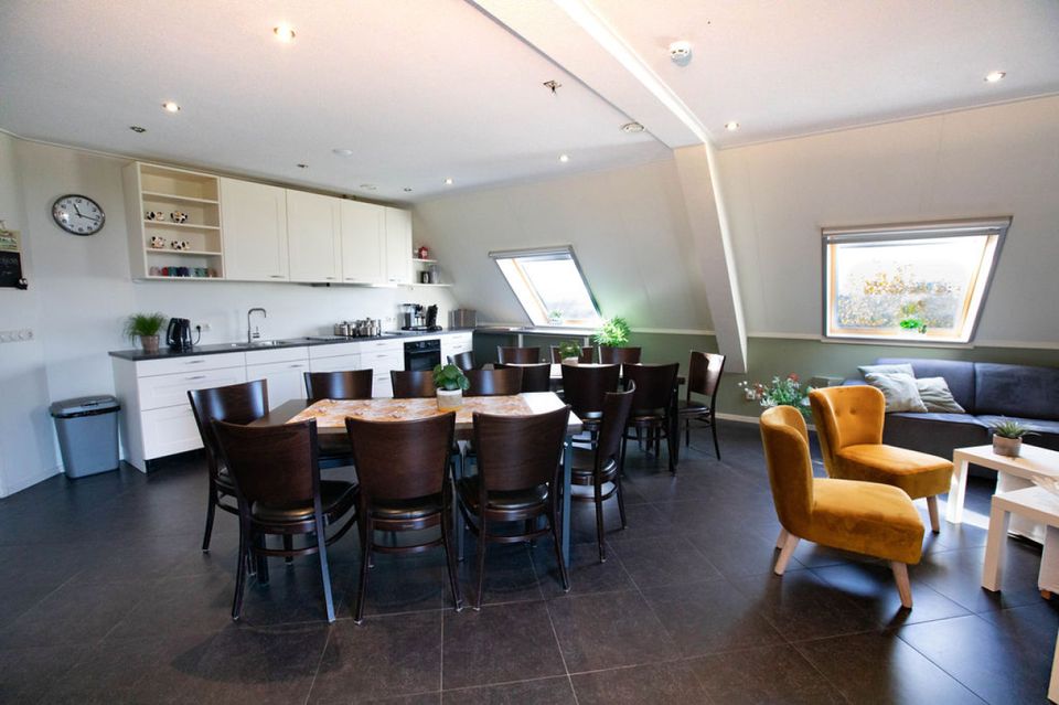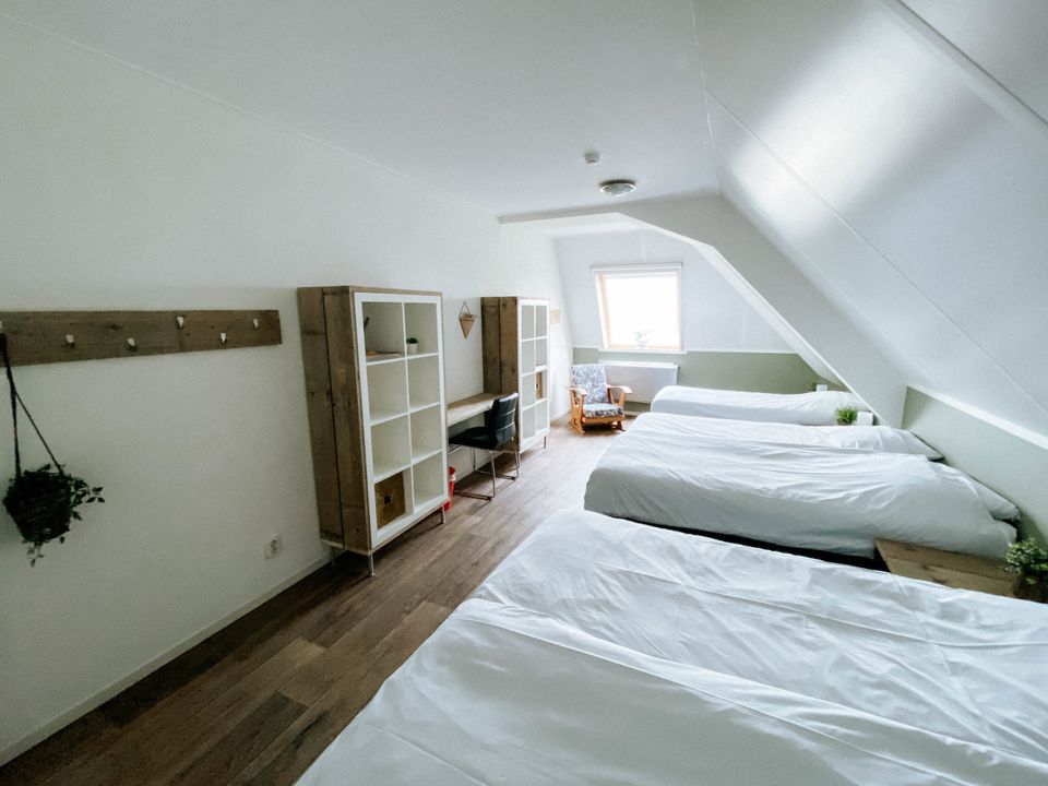 Midden tussen de weilanden en de grazende koeien vind je deze luxe ruime groepsaccommodatie. Via een eigen opgang betreed je de accommodatie op de eerste verdieping van de boerderij. Hier vind je de gezamenlijke huiskamer met keuken en dakterras waar je gezellig kunt zitten. De keuken beschikt over onder andere een ruimte koelkast, fornuis, vaatwasser, combi magnetron, koffiezetapparaat en Senseo. Ook vind je op de eerste verdieping 4 luxe boerderij hotelkamers. Elke kamer beschikt over een eigen toilet en douche en heeft een heerlijk tweepersoonsbed. Een van deze hotelkamers beschikt over een extra grote badkamer met een ligbad, toilet en douche. Deze kamer heeft 2 luxe seniorenbedden en zorgfaciliteiten. Op de tweede verdieping van de accommodatie zijn nog twee familiekamers te vinden voor elk 5 personen. Beide kamers beschikken over 5 eenpersoons boxspring bedden. Ook hier is een groot toilet en een aparte douche. De accommodatie beschikt over een grote personenlift, zodat je gemakkelijk de eerste verdieping kunt bereiken. Bovendien zijn de dakramen allemaal op zithoogte, zodat je het prachtige Friese landschap kunt overzien. Heerlijk vertoeven met het hele gezin, de familie of een vriendengroep.